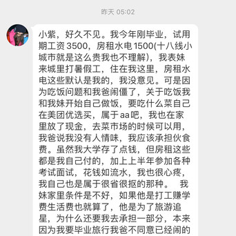 我今年刚毕业,试用期工资3500,房租水电1500(十八线小城市就是这么贵我也不理解),我表妹来城里打暑假工,住在我这里,房租水电这些默认是我的,我没意见。可是因为吃饭问题和我爸闹僵了,